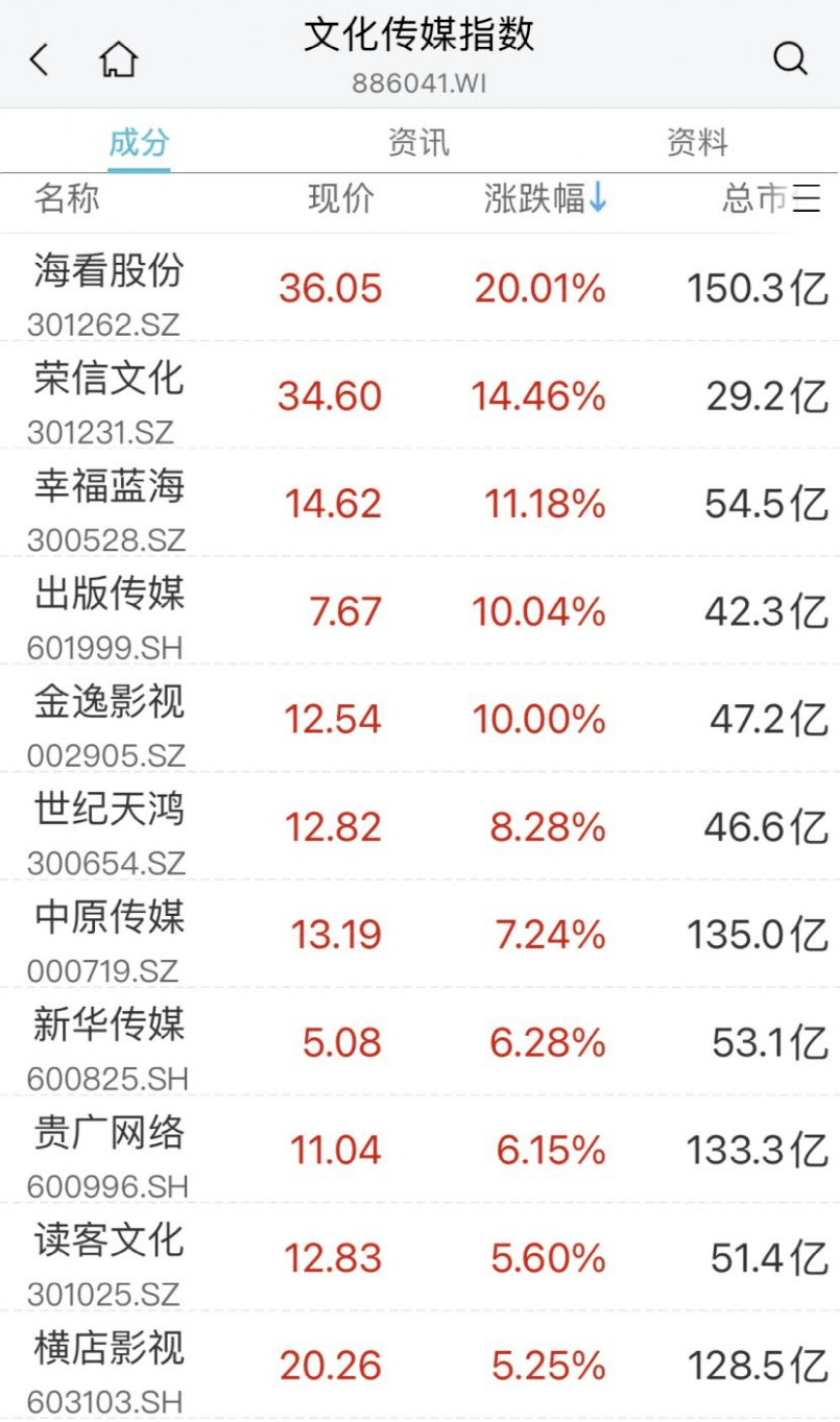 文化传媒股直线拉升,海看股份20CM涨停,荣信文化、幸福蓝海涨超10%,出版传媒、金逸影视涨停,世纪天鸿、中原传媒、新华传媒涨超6%。