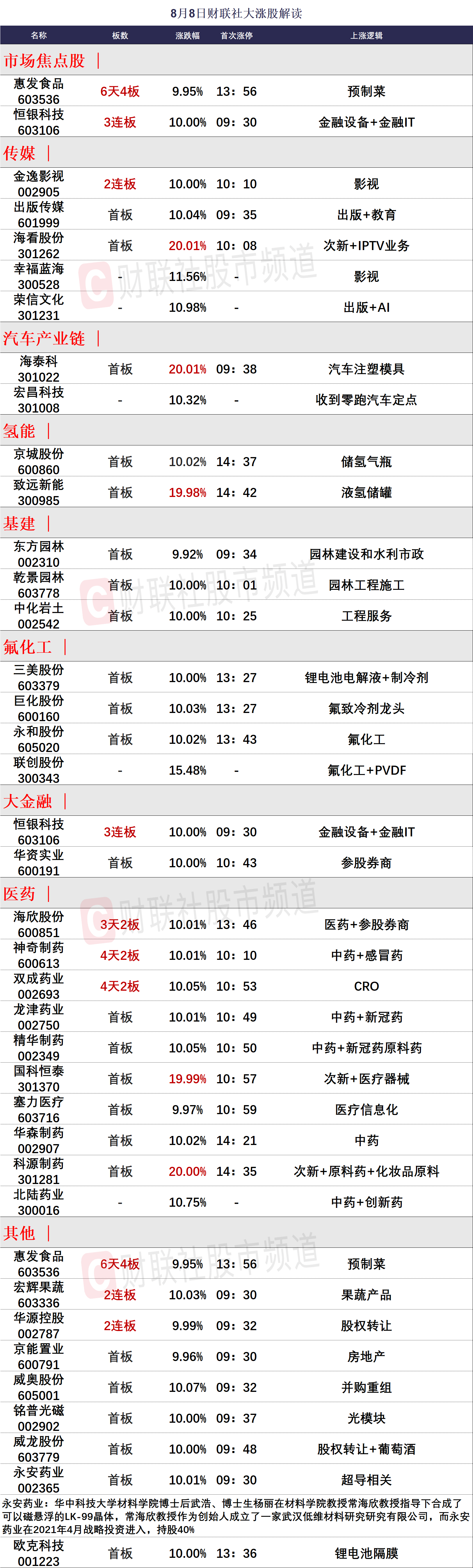 【8月8日涨停分析】今日共32股涨停,连板股总数4只,7股封板未遂,封板率为82%(不含ST股、退市股及未开板新股)。个股方面,预制菜概念股惠发食品6天4板,大金融板块恒银科技3板,传媒股金逸影视2板、海看股份创业板首板,农业种植板块宏辉果蔬2板,股权转让的华源控股2板,医药板块海欣股份3天2板、神奇制药4天2板、双成药业4天2板,氢能概念股致远新能创业板首板。今日收涨个股1955只,收跌个股2878只。