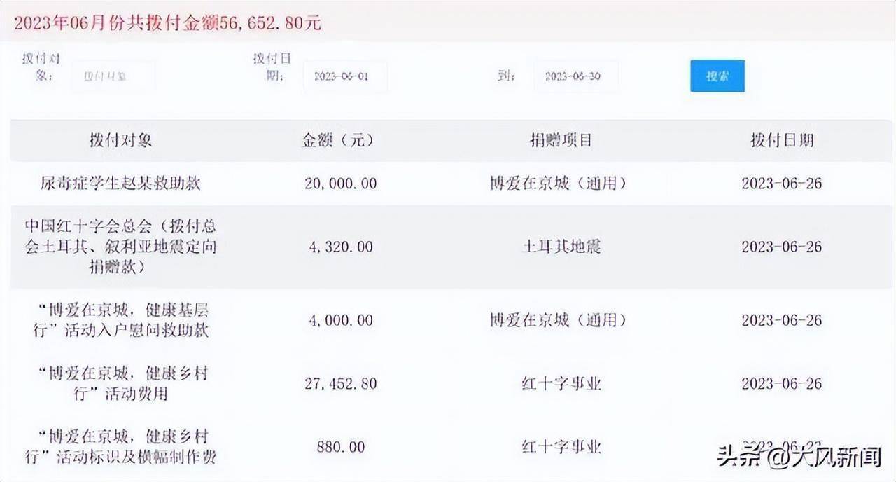 8月7日,华商报大风新闻记者查询北京市红十字会官网发现,在社会捐助信息之“款物使用信息”栏目中,2023年6月份救助信息公示显示,“博爱在京城,健康基层行”活动入户慰问救助款为4000元;“博爱在京城,健康乡村行”活动费用为27452.8元;“博爱在京城,健康乡村行”活动标识及横幅制作费为880元。