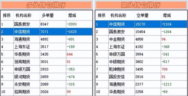 先来看下对下一个交易日有预判作用的“神器”——中信期货在股指期货上的增减持情况。它在沪深300股指期货上多单方面减仓2628手,空单方面减仓2104手,给出了“偏空”的信号——预判正确。