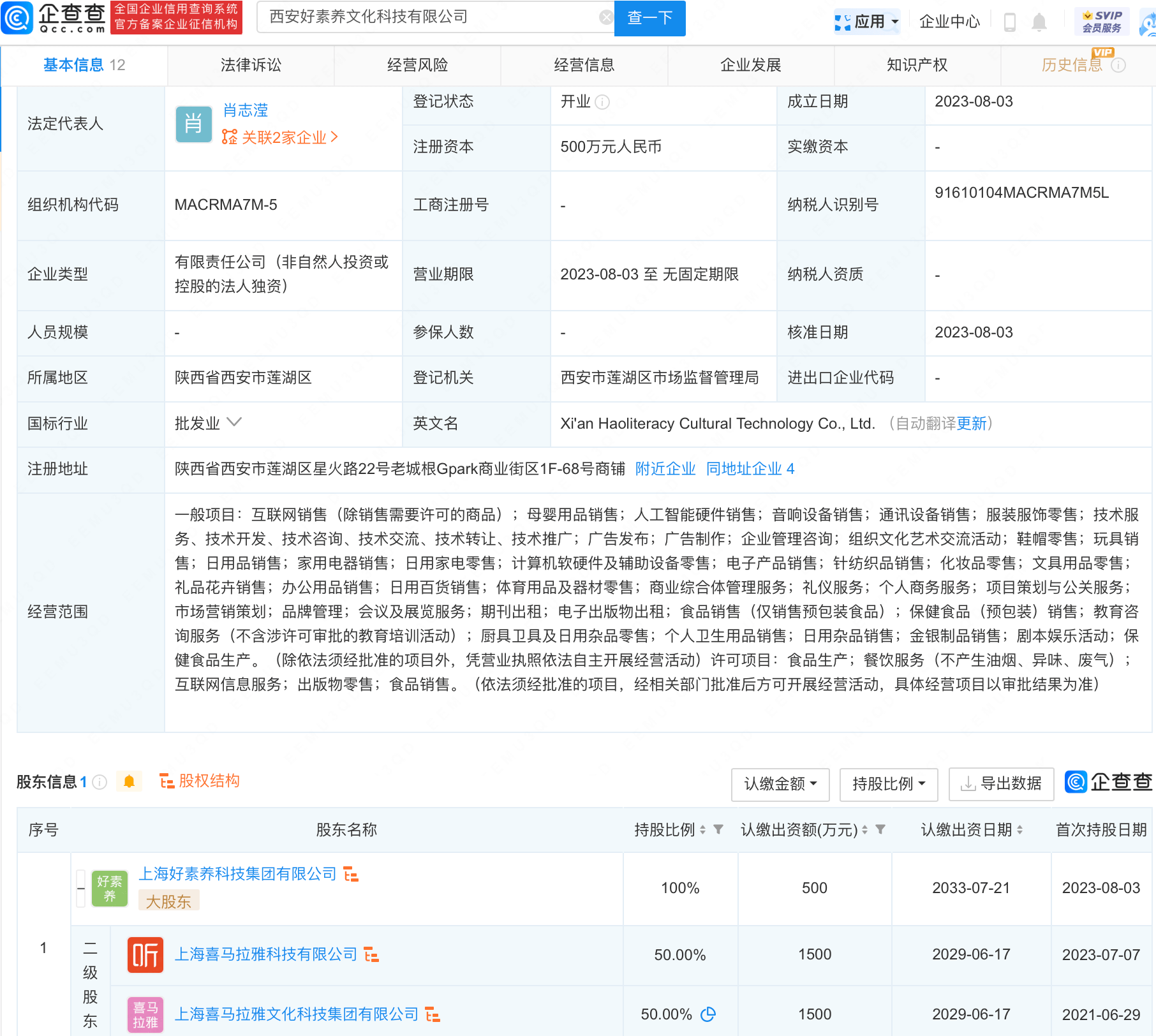 企查查APP显示,近日,西安好素养文化科技有限公司成立,法定代表人为肖志滢,注册资本500万元人民币,经营范围包含:互联网销售、人工智能硬件销售、剧本娱乐活动、互联网信息服务等。企查查股权穿透显示,该公司由喜马拉雅旗下上海好素养科技集团有限公司全资持股。
