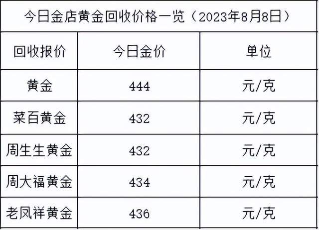 今日金价不变,黄金回收价格则是微跌,跌幅为1元/克。同时,每个品牌的回收价格也不一样,小金大致整理了几个,详见下表,数据仅供参考:
