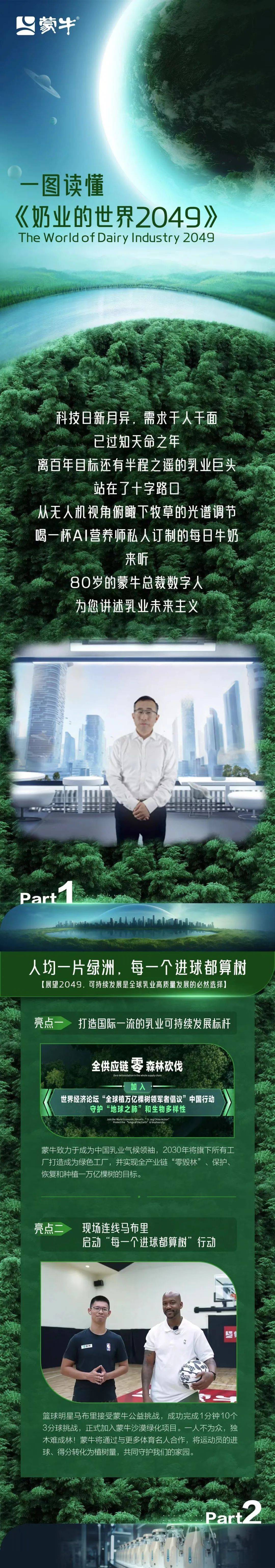实现全产业链“零毁林”目标是蒙牛率先做出的绿色承诺。蒙牛已经加入“世界经济论坛,全球植万亿棵树领军者倡议”,未来将携手全球生态圈伙伴,实现2030年前“保护、恢复和种植一万亿棵树”的目标,实现森林正效。国际篮球明星马布里在会上与李鹏程进行了直播连线,成功完成1分钟10个3分球的挑战,正式加入蒙牛沙漠绿化公益项目。据悉,蒙牛将持续开展植树公益活动,联动各项运动赛事,将每一个进球和得分都转化为一棵棵树木,种在乌兰布和沙漠,实现2049人均一片绿洲的可持续发展愿景。