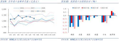 分国家看,7月份,我国从俄罗斯进口同比转负,是2021年3月以来的首次。7月份中国从日、韩进口额同比分别下降14.7%和23.0%,分别拖累我国进口-1和-1.7个百分点,从欧盟、美国进口额同比分别下降3.0%和11.2%,分别拖累我国进口-0.3和-0.7个百分点,而我国从俄罗斯进口金额同比下降8.1%,拖累我国进口金额下降0.4个百分点,也是俄罗斯2021年3月以来首次对我国进口总额形成拖累。