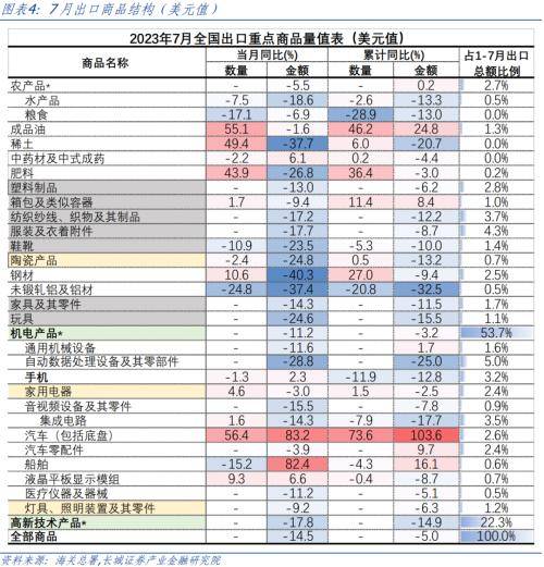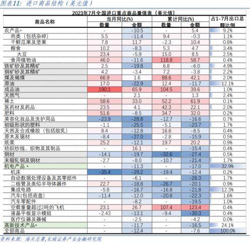 按出口商品结构拆分,6月份延续了上个月的特点,汽车出口是为数不多的亮点。从大类看,7月份劳动密集型商品、机电产品、高新技术产品出口金额分别同比下降18.4%、11.9%和18.1%,分别拖累全部出口下降约3.3、6.1和4.1个百分点。从具体商品看,汽车出口增速仍然远高于其余品类,7月份同比仍在80%以上的高位。但传统机电产品中的自动数据处理设备、音视频设备、集成电路,以及高新技术产品,出口同比降幅都在十位数以上。