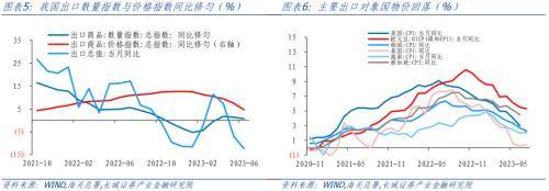 按量价角度拆分,二季度以来我国出口总额走弱,主要是出口价格下行的影响,出口数量维持相对平稳。主要出口国家物价指数明显回落,我国出口价格指数也出现明显下降趋势。根据海关总署公布的最新数据,二季度我国出口量涨价跌,出口数量同比增长约2.9%,出口价格同比下降约0.6%。7月份,从已公布的商品出口量值表来看,出口价格同比下降的趋势仍在延续,部分商品出口数量也在下降。量价齐跌或将成为三、四季度的新特点。