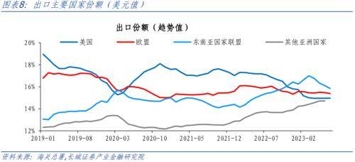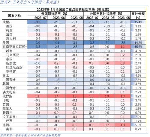 按出口国家拆分,7月份延续了5、6月份的特点,我国稳外贸、拓市场效果仍有显现,但难以完全弥补欧美国家的出口下滑趋势。俄罗斯对我国出口拉动1.1个百分点,拉动作用较为突出。我们以亚洲剔除日本、韩国、东盟等国剩余的国家表示“其他亚洲国家”,从已经公布的数据来看,截至6月份其他亚洲国家占我国出口份额仍是在上升的。随着5月份中国-中亚峰会的召开,其他亚洲国家经贸形势较稳定,出口份额可能还有上升空间。不过我国传统的贸易三大伙伴东盟、欧盟、美国对我国出口拉动均仍为负值。7月我国对东盟、欧盟、美国出口同比分别为-21.4%、-20.6%和-23.1%,分别拖累出口下降3.5、3.3和3.9个百分点。