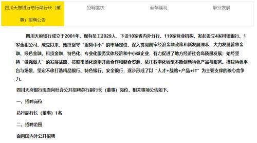 8月7日,四川天府银行官网发布公告,面向社会公开招聘总行副行长(董事)1名。
