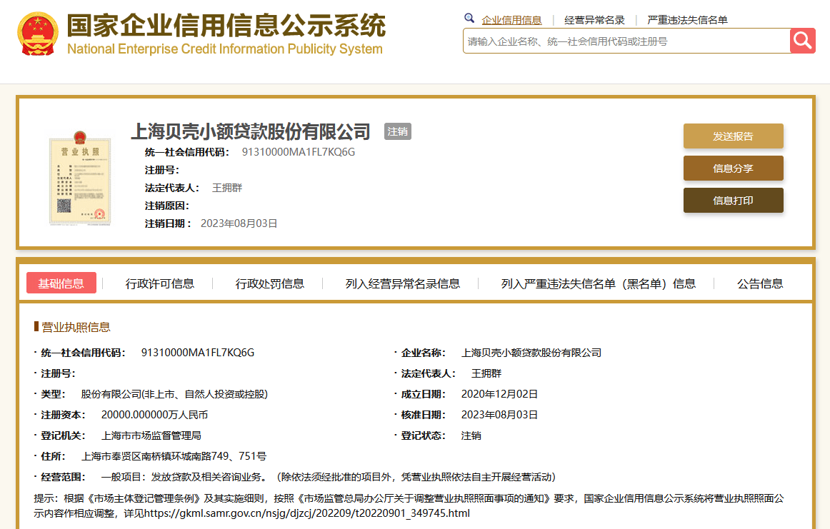 8月3日,贝壳旗下上海贝壳小额贷款股份有限公司(以下称上海贝壳小贷)注销。此前在今年2月,该公司已决议解散,并进行了债权人公告。