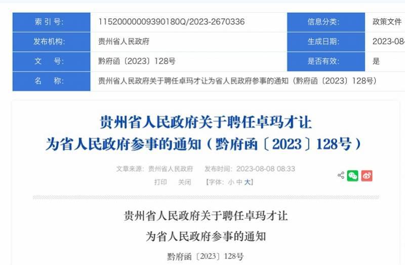 8月8日,贵州省人民政府网站发布《关于聘任卓玛才让为省人民政府参事》的通知。通知内容显示,聘任卓玛才让同志(中国贵州茅台酒厂〔集团〕有限责任公司党委副书记)为省人民政府参事,聘期五年,聘期届满时自行离任。