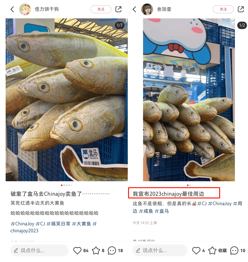 等身大黄鱼抱枕过于魔性,尽管要做游戏才能获得大黄鱼,且游戏通关难度不低,高峰期甚至要排至少1小时的队,但还是有不少人在盒马的展台为了这条鱼努力尝试。背着大黄鱼到处逛展,你就是人群中耀眼的崽,十传百百传千,堪称行走的种草机。在其他平台上,这条鱼一度被炒了666元。