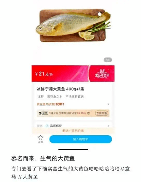 让盒马口碑扭转的是一条纹路细腻逼真、眼神清澈坚毅、体长1米80(后来在盒马直播间被现场测体长更正为1米72)的大黄鱼。在去年,盒马商品页面上的大黄鱼就凭坚毅的眼神、愤怒的表情把盒马“傻鱼专营店”的名声送出了圈,今年,盒马直接把网红黄鱼做成了等身抱枕,作为现场游戏通关的赠品送给到场的游客。