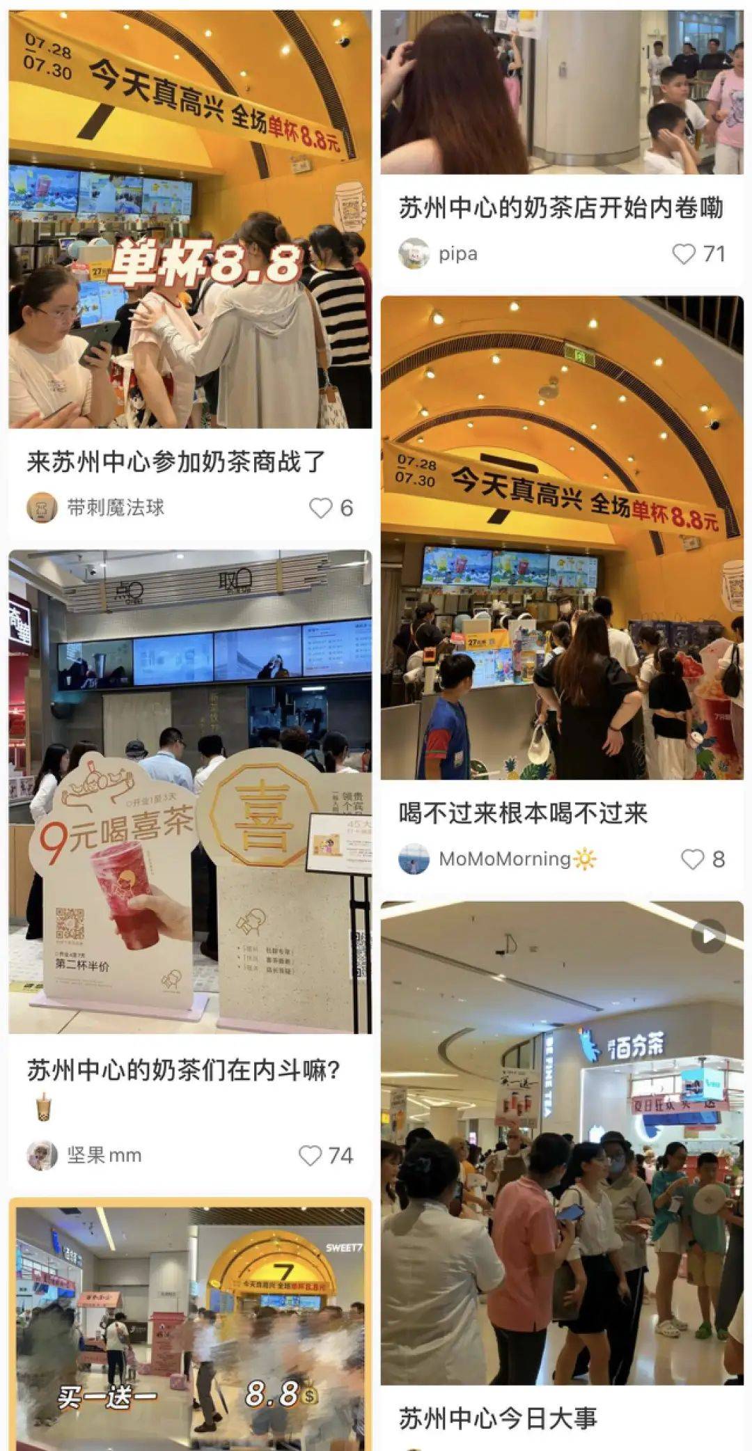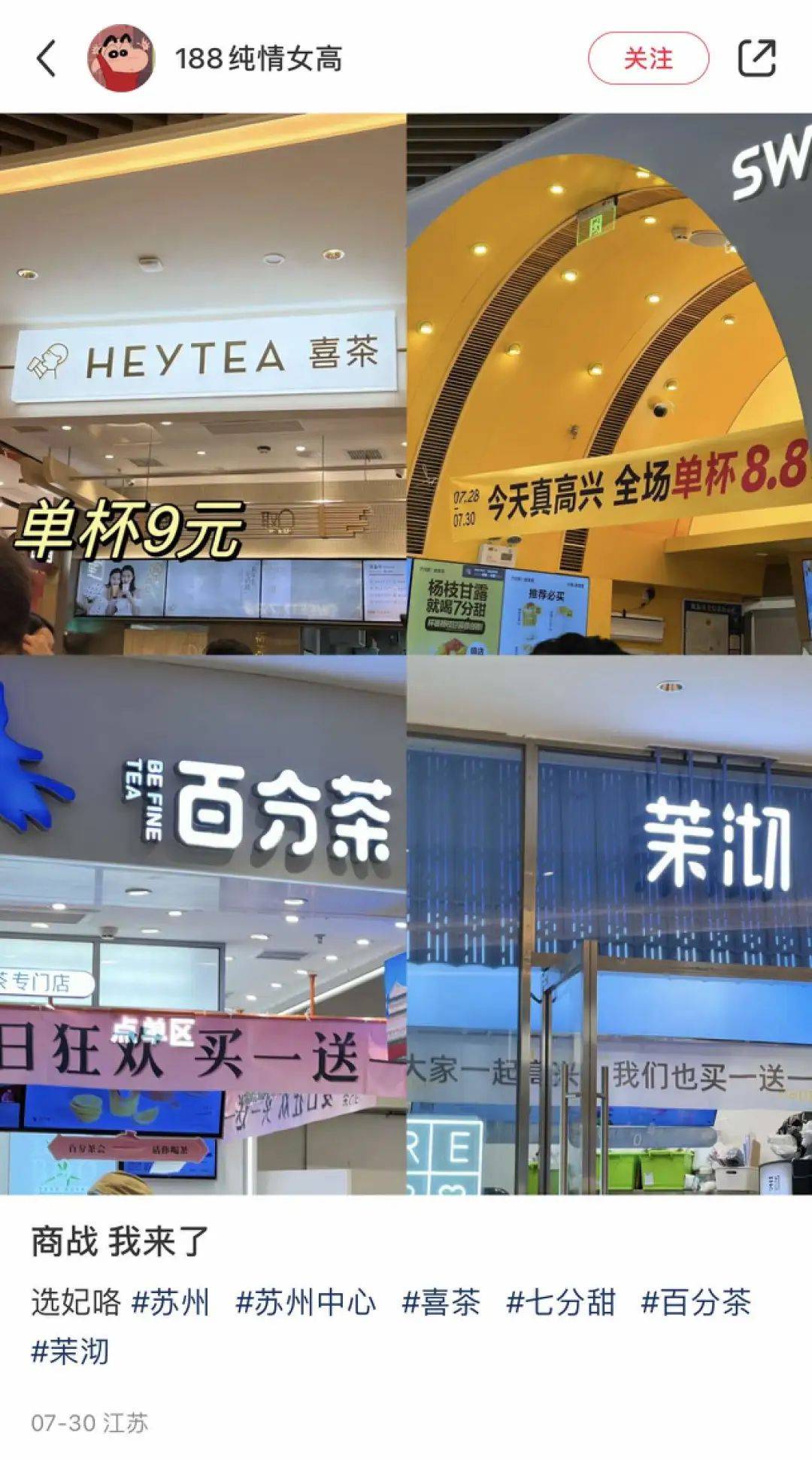 而作为打响新茶饮价格战第一枪的喜茶,最近则在“苏州战场”遭遇了本地新茶饮品牌集体正面开火,第一次让人近距离的、具象的感受到这个行业里的竞争到底有多激烈。