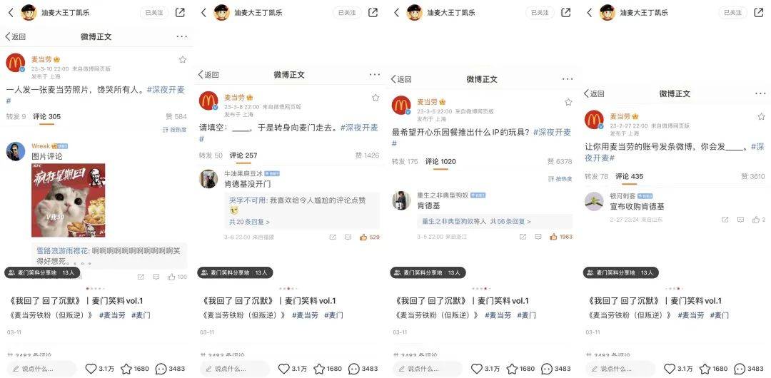单看麦当劳的评论区,这些麦当劳铁粉(叛逆版)已经贡献了一整本麦门笑料。如麦当劳求一张麦当劳照片馋哭所有人,肯德基疯狂星期四表情包占热评高位;麦当劳出填空题,网友故意填“肯德基没开门,于是转身向麦门走去”;麦当劳问网友最希望儿童乐园餐推出什么IP的玩具,果不其然“肯德基”又位居高位提名;让网友用麦当劳的账号发条微博,网友表示那肯定是要发“宣布收购肯德基”……