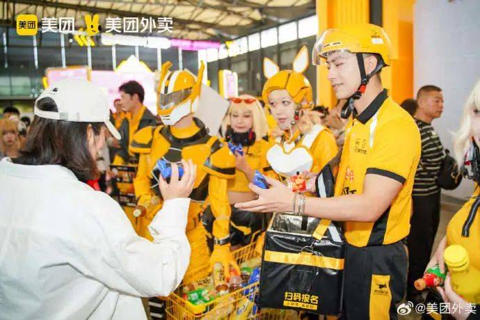 另一位让人意外的跨界选手美团,不仅有面积几乎是其他展台2倍的巨大展厅,还在“饮食短缺”的场馆里干上了老本行,派出了一支二次元骑手队伍整个场馆巡游送外卖,对很多游客来说,逛展本来就是“特种兵”行程,又热又渴的时候能喝上美团黄骑手送来的水,还可以去美团展台歇歇脚,怎么不算是一种救赎呢!