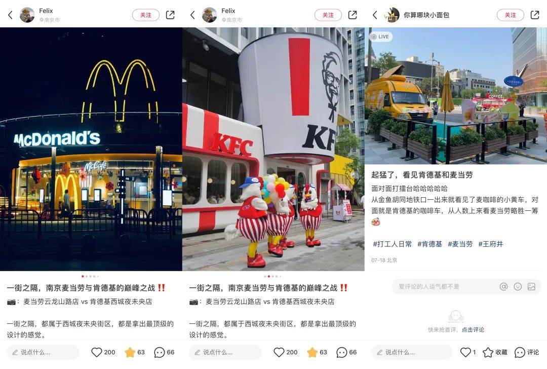 仅从最近来看,一位南京的网友发现当地西城夜未央街区一街之隔的麦当劳和肯德基似乎都拿出了顶级门店设计,引来网友在评论区投票哪家门店更好看。一位北京的网友在地铁口偶然目击到麦咖啡小黄车对面就是肯德基咖啡车,还得默默对比一下哪家车前面人数多。