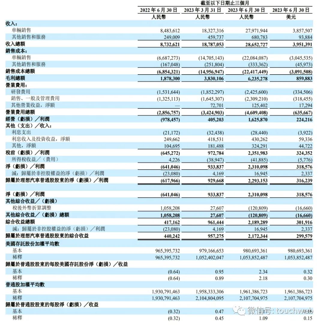 理想汽车2023年第二季度的净利润为23.1亿元(3.19亿美元),而2022年第二季度的净亏损为6.41亿元。
