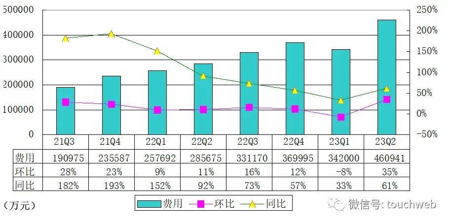 理想汽车2023年第二季度费用为46.1亿(6.36亿美元),较2022年第二季度的28.6亿元增加61.4%,较2023年第一季度的34.2亿元增加34.6%。