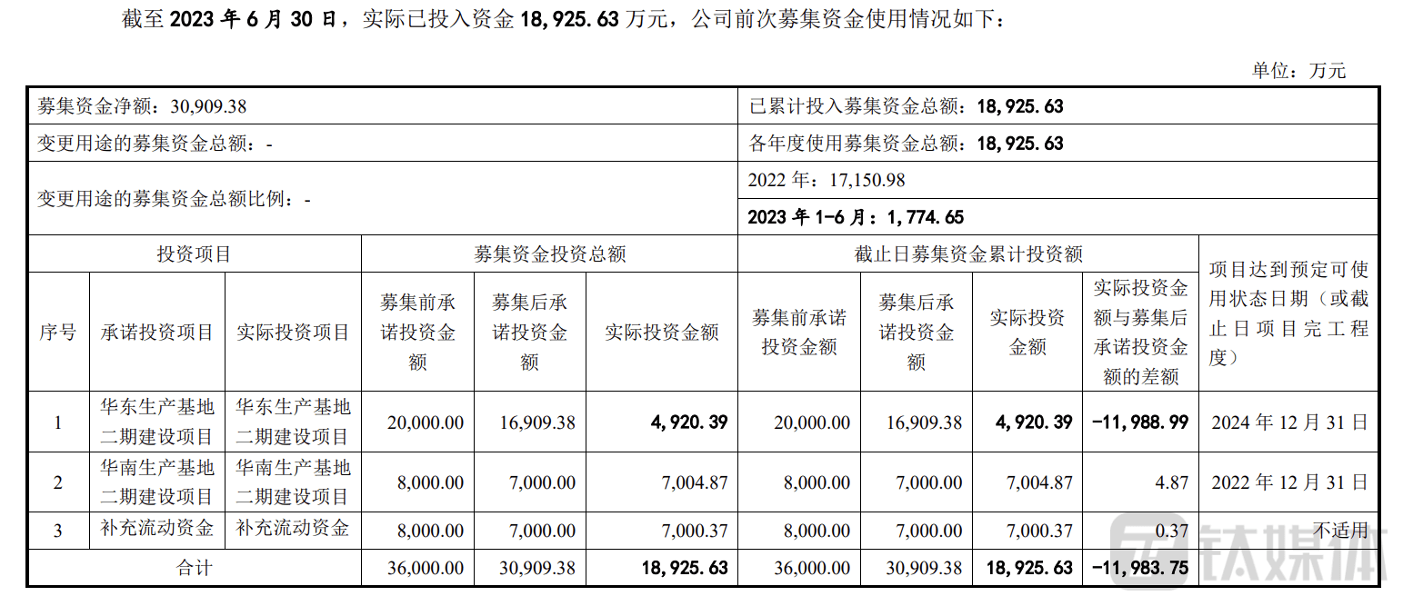 需要说明的是,2022年3月,首发上市,共募资3.59亿元,扣除发行费募集资金净额为3.09亿元,其中2亿元用于建设华东生产基地二期建设项目(下称华东二期项目)、8000万元用于建设华南生产基地二期建设项目(下称华南二期项目),上述两个项目达产后预计将新增各类改性塑料产品产能分别为10万吨、5万吨。