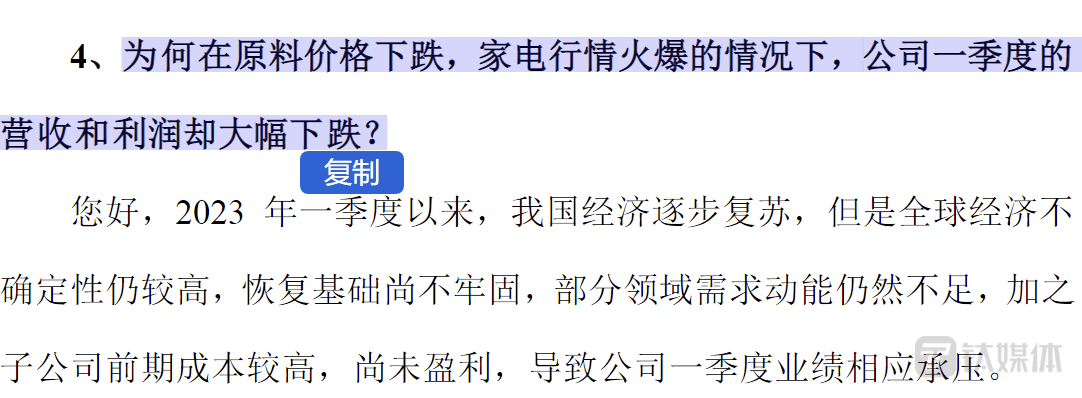 针对上述毛利率和业绩均下滑等问题,深交所在首轮问询函中对公司进行追问。此外,钛媒体APP注意到,在2022年度业绩说明会上,有投资者对此亦提出质疑“为何在原料价格下跌,家电行情火爆的情况下,公司一季度的营收和利润却大幅下跌?”