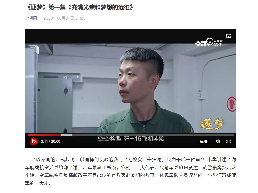 内容出自央视的新栏目《逐梦》里的第一集,当时解放军山东舰航母编队,正在西太平洋接近台岛东侧的海域,进行远洋海训。前面内容还很正常,是舰载机正常的起降训练。