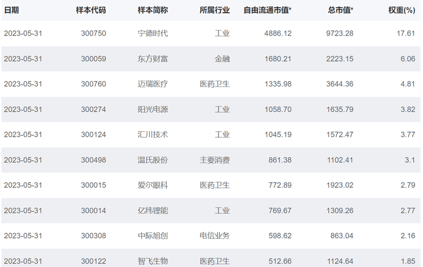 截至2023年5月31日,该指数前十大权重股包括宁德时代、东方财富、迈瑞医疗、阳光电源、汇川技术等。(数据来源:国证指数公司,指数成份股不代表个股推荐)