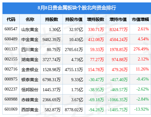 北向资金方面,当日贵金属板块北向资金持股市值为64.5亿元,增持1.29亿元。其中增持最多的是山东黄金,增持了0.83亿元。减持持最多的是西部黄金,减持了0.14亿元。贵金属板块北向资金持股变动明细见下表: