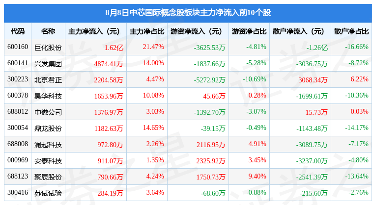 8月8日中芯国际概念股板块较上一交易日上涨0.01%,巨化股份领涨。当日上证指数报收于3260.62,下跌0.25%。深证成指报收于11098.44,下跌0.42%。中芯国际概念股板块个股涨跌见下表: