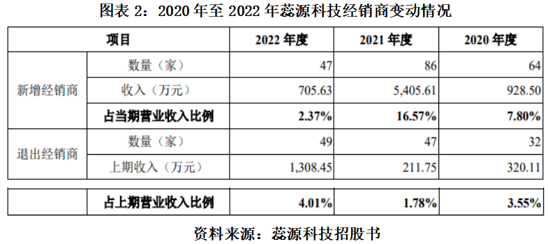 据招股书,2020—2022年,蕊源科技新增的经销商数量分别为64家、86家、47家,占当期营业收入的比例分别为7.80%、16.57%、2.37%;退出的经销商数量分别为32家、47家、49家,占上期营业收入的比例分别为3.55%、1.78%、4.01%。