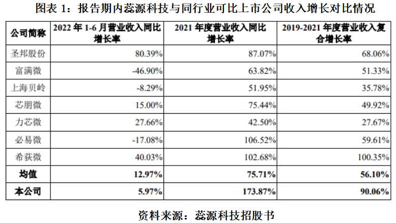 招股书显示,2019年至2021年,蕊源科技的营业收入复合增长率为90.06%,而同期同行业可比公司的营收复合增长率均值为56.10%,蕊源科技的营收增幅显著高于同行业可比公司平均水平。