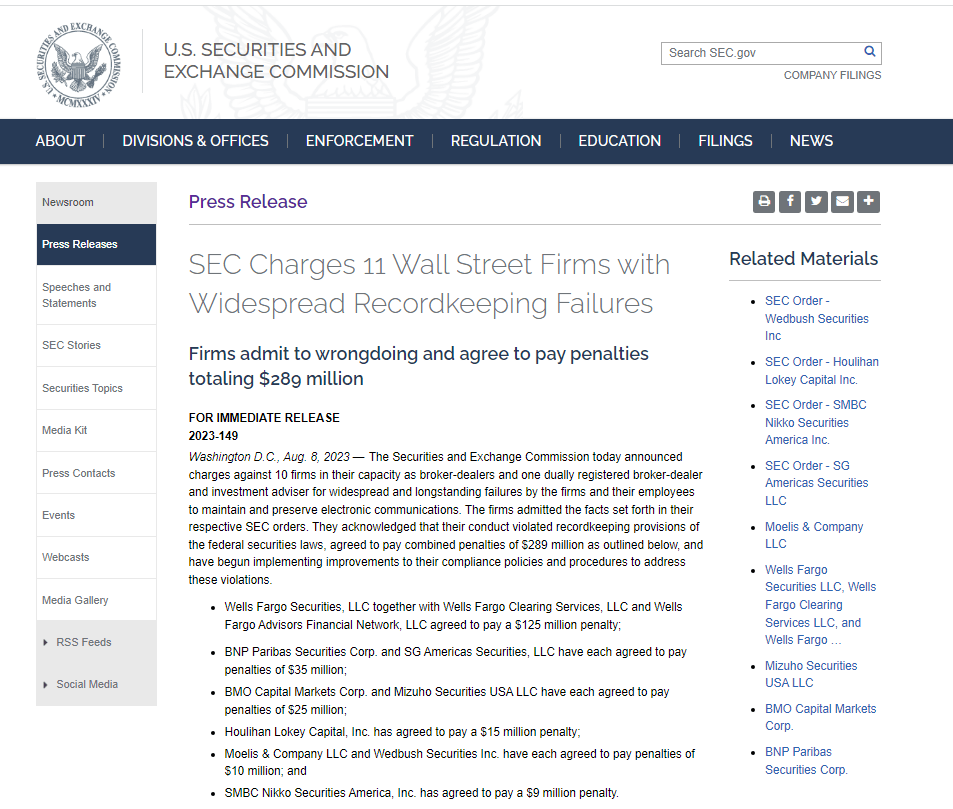 美国证券交易委员会(SEC)当地时间8月8日公告,对10家经纪交易商、1家双重注册的经纪交易商和投资顾问公司提出指控,原因是这些公司及其员工存在未持续维护和保存电子通信记录等不当行为。受到指控的11家机构承认其行为违反了美国证券法的相关条例,并同意支付合计2.89亿美元的罚款。
