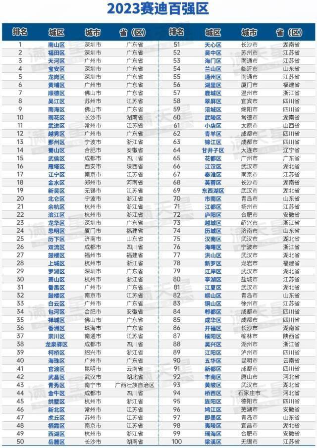 在2023年赛迪百强区中,东部、中部、西部和东北地区分别上榜59个、22个、18个和1个城区。其中,深圳南山区、深圳福田区、广州天河区、深圳宝安区、深圳龙岗区、广州黄埔区、佛山顺德区、苏州吴江区、佛山南海区和长沙雨花区位列2023年赛迪百强区前十。