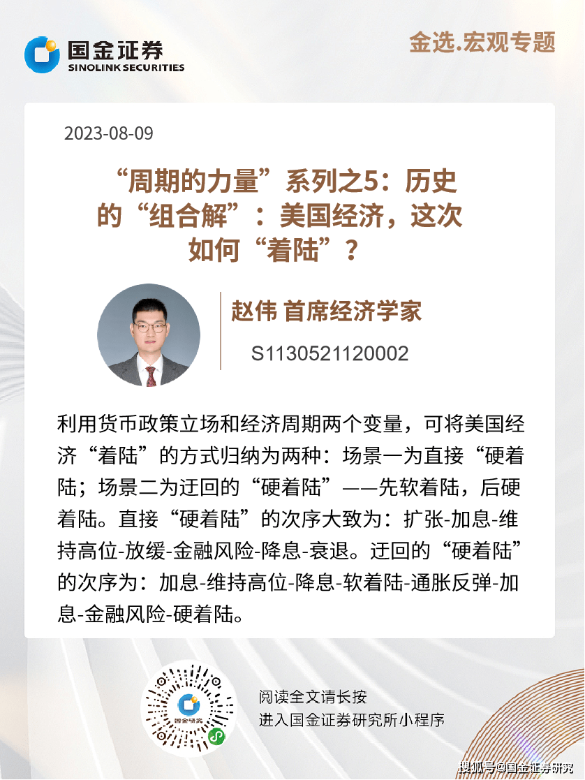 利用货币政策立场和经济周期两个变量,可将美国经济“着陆”的方式归纳为两种:场景一为直接“硬着陆;场景二为迂回的“硬着陆”——先软着陆,后硬着陆。直接“硬着陆”的次序大致为:扩张-加息-维持高位-放缓-金融风险-降息-衰退。迂回的“硬着陆”的次序为:加息-维持高位-降息-软着陆-通胀反弹-加息-金融风险-硬着陆。