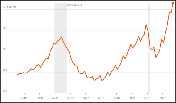 相较今年的第一季度,4月至6月期间,美国信用卡债务上升了450亿美元(约合3240万亿元人民币),即4.6%,相较去年同期则增长了16.2%。纽约联邦储备银行分析,这部分反映了美国民众持续强烈的消费欲望,但是也体现了物价总体的上涨趋势,而利率的上涨以及部分银行的破产倒闭也加重了美国消费者面临的压力。