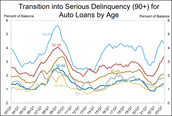 美国汽车贷款严重拖欠率分年龄段走势(图源:纽约联邦储备银行)