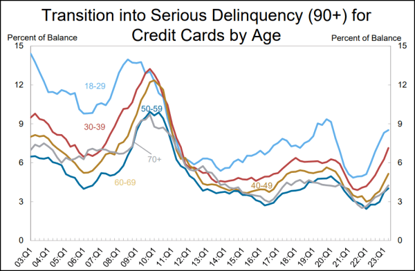 美国信用卡贷款严重拖欠率分年龄段走势(图源:纽约联邦储备银行)