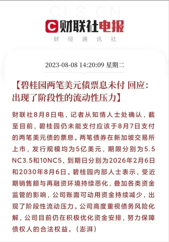 碧桂园方面对媒体回应,受近期销售额与再融资环境持续恶化,叠加各类资金监管的影响,公司账面可动用资金持续减少,出现了阶段性流动压力。公司高度重视债务风险化解,目前仍在积极优化资金安排,努力保障债权人的合法权益。不过,上述两笔票据仍有30天付息宽限期。