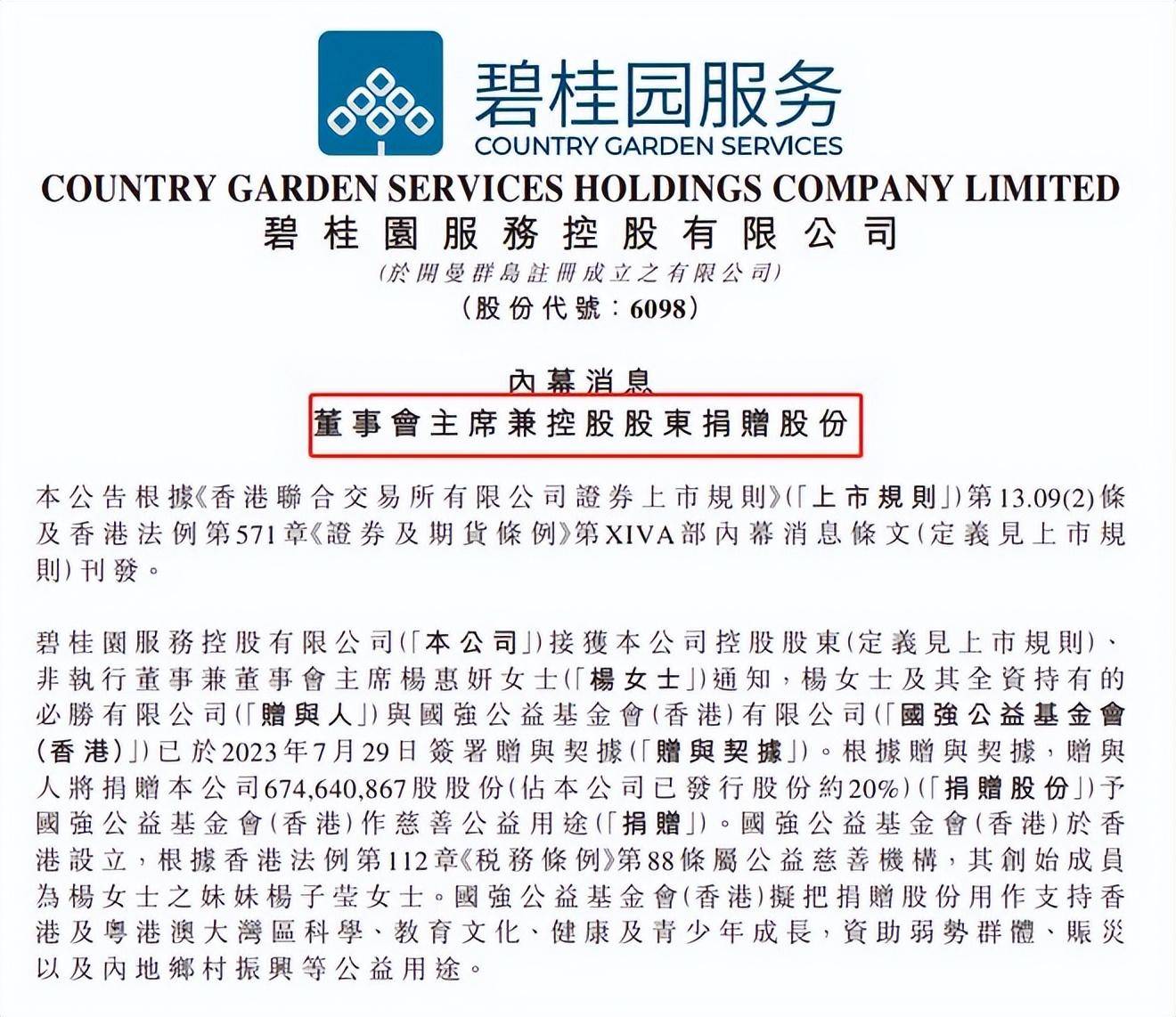 一个值得注意的细节是,7月30日,杨惠妍把碧桂园服务20%的股权,合计64亿直接捐给了杨国强的慈善基金公司。基金会又把投票权委托给还给了杨惠妍。等于是左手倒右手,地产与物业做到了隔离。