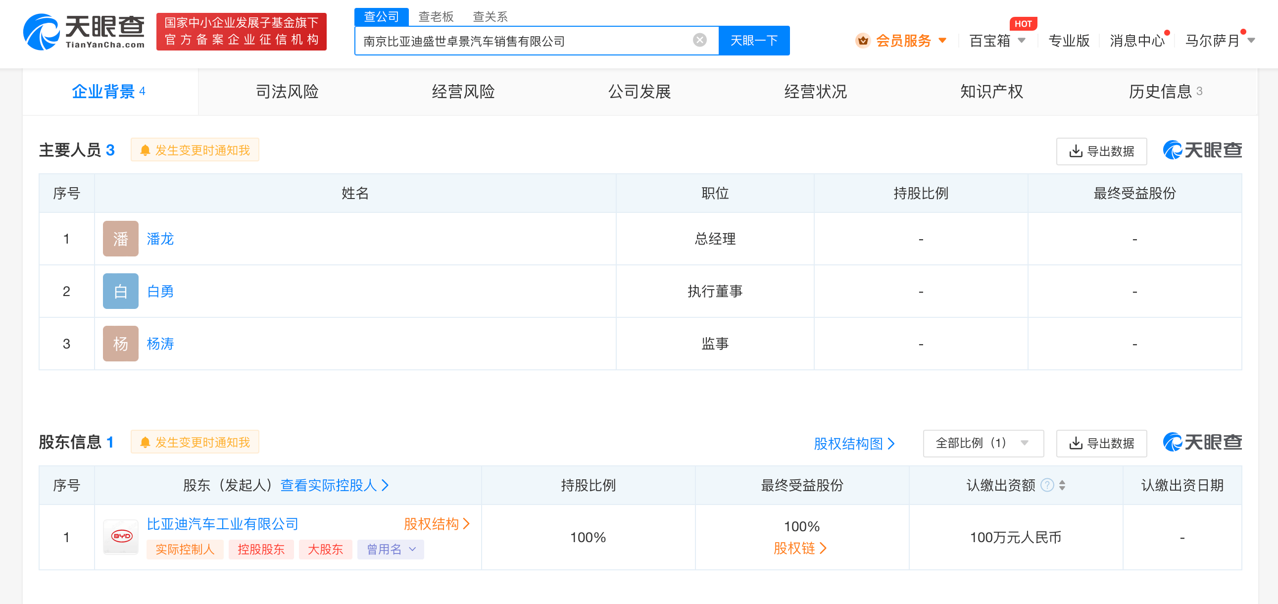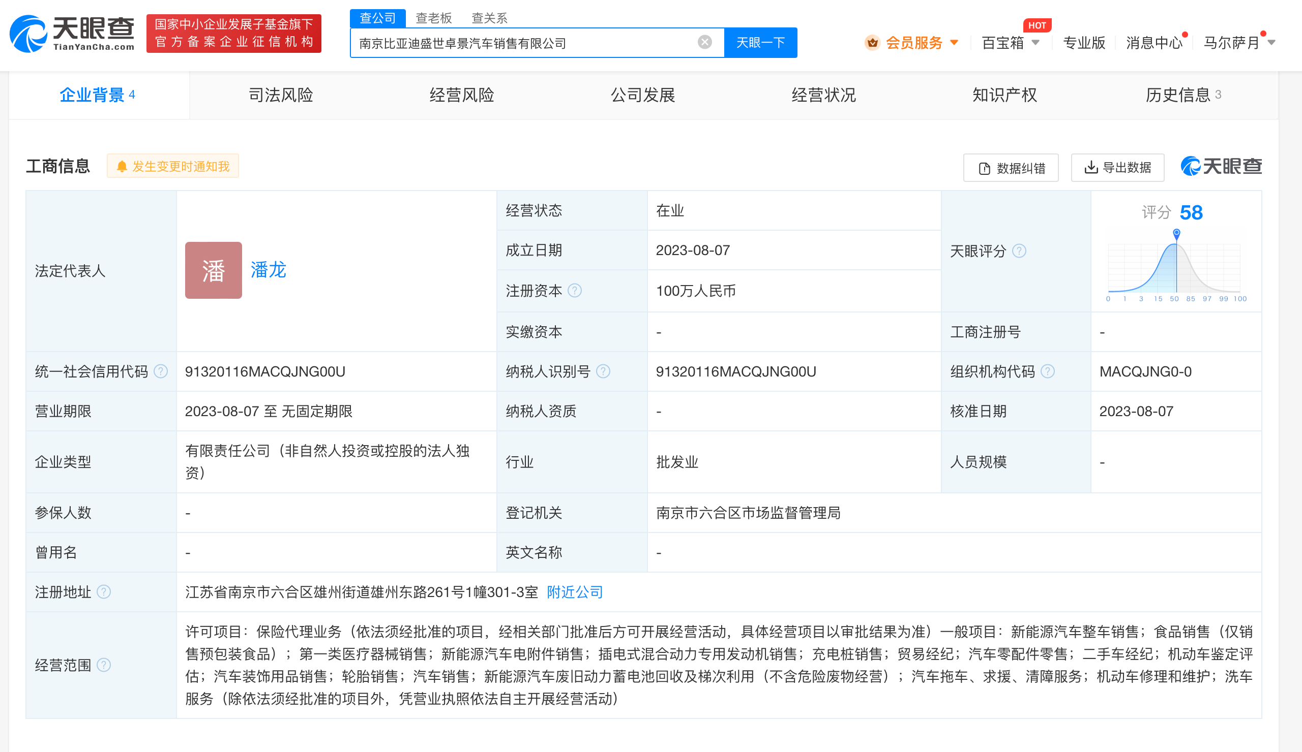 天眼查App显示,8月7日,南京比亚迪盛世卓景汽车销售有限公司成立,法定代表人为潘龙,注册资本100万人民币,经营范围包括保险代理业务、新能源汽车整车销售、第一类医疗器械销售、二手车经纪、新能源汽车废旧动力蓄电池回收及梯次利用、洗车服务等。