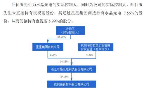 招股书显示,叶仙玉同时为水晶光电和夜视丽实控人。叶仙玉持有星星集团85%的股份,而星星集团持有水晶光电普通股股数123,753,273股,最后通过水晶光电间接持有夜视丽的股份。重要的是,在星星集团持有水晶光电的这123,753,273股中,有97,850,000股处于质押状态,占星星集团持股比例的79.07%,占水晶光电股本的7.04%。