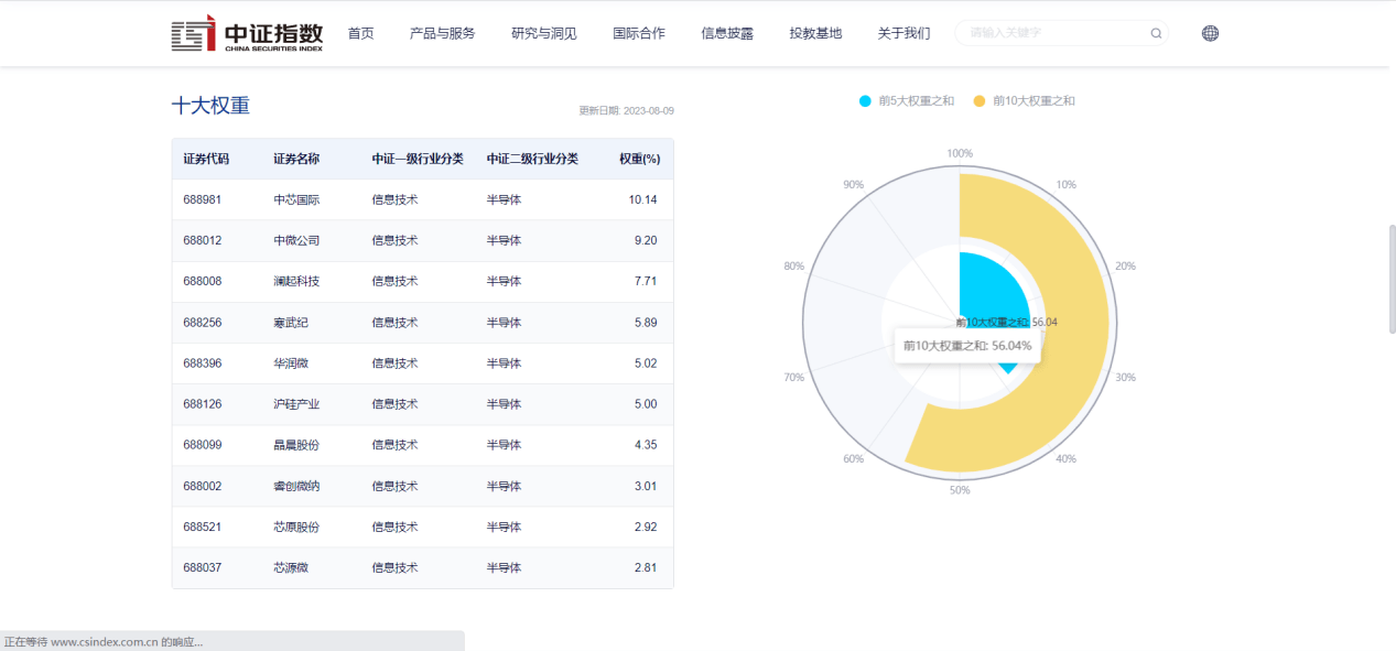 截至2023年8月9日,该指数前十大权重股包括中芯国际、中微公司、澜起科技、寒武纪、华润微等,前十大权重股合计占比56.04%。(数据来源:中证指数公司,指数成份股不代表个股推荐)