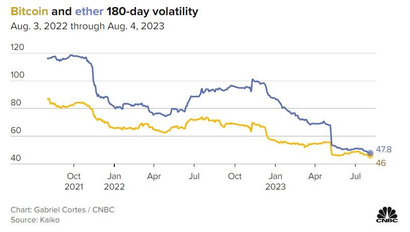 今年早些时候,美国银行业危机一度引发比特币的大幅上涨,因投资者重新发现了比特币作为替代银行体系的吸引力。数字资产市场研究公司Kaiko表示,在银行业危机似乎逐渐消退后,比特币和以太币交易的波动性在5月份大幅下降,目前处于多年来的低点。