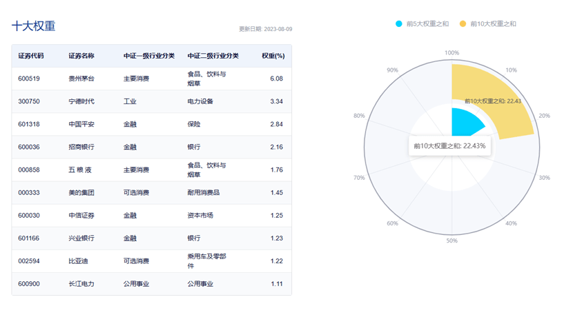 截至2023年8月9日,该指数的前十大权重股包括贵州茅台、宁德时代、中国平安、招商银行、五粮液等各行业龙头个股,前十大权重股集中度22.43%。(数据来源:中证指数公司,指数成份股不代表个股推荐)