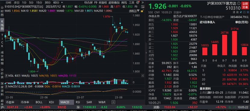 截至10:05,沪深300ETF易方达(510310)现报1.926元,盘中跌0.05%,成交额已达1.14亿元,成交额持续放大,市场交投活跃。数据显示,沪深300ETF易方达(510310)最近连续20个交易日获得资金净流入,合计“吸金”超60亿元。