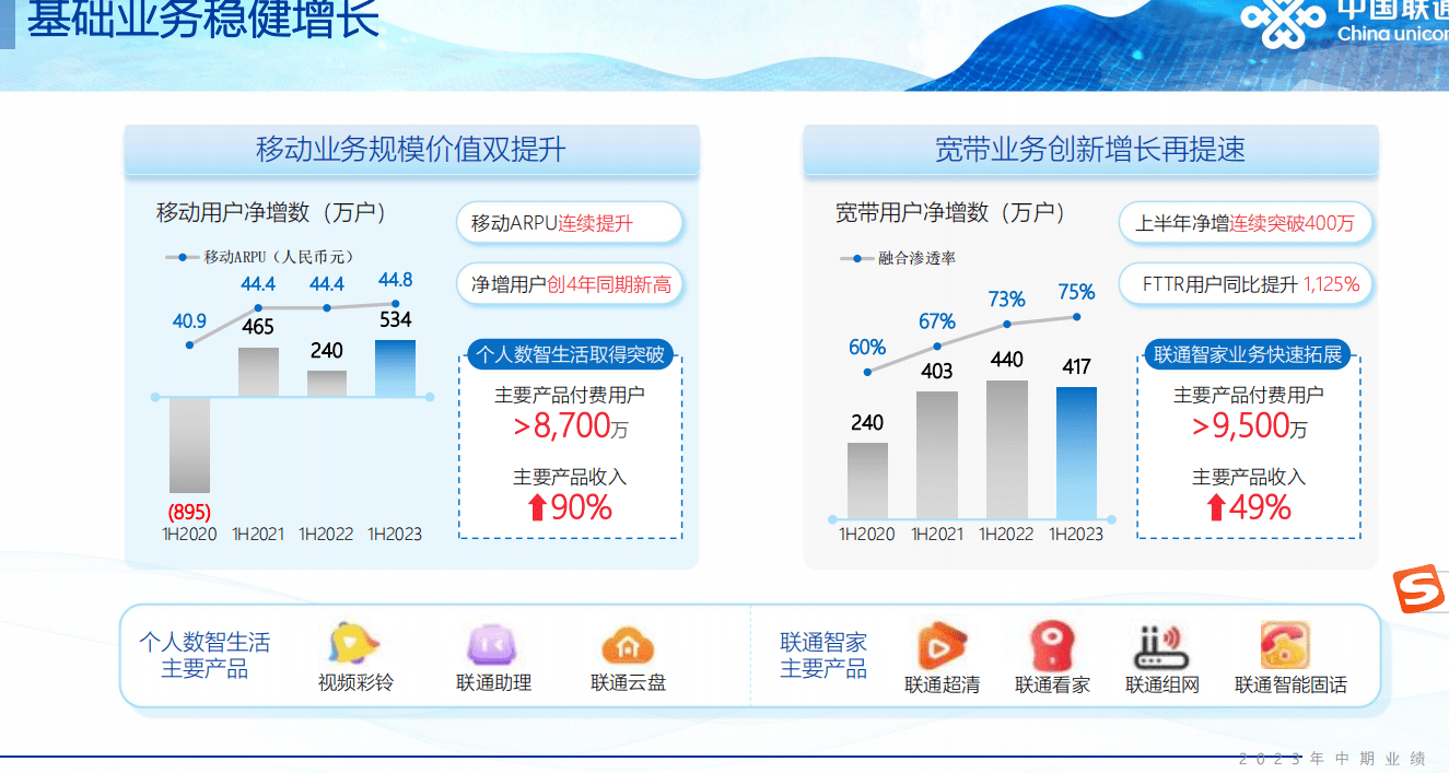 从细分领域看,传统业务方面,报告期内中国联通移动出账用户超3.28亿户,上半年净增用户534万户;5G套餐用户渗透率超过70%;固网宽带出账用户1.08亿户,半年用户净增超400万。