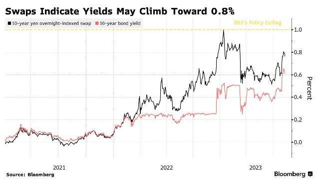 投资者继续对冲10年期国债收益率的进一步上涨,该期限的隔夜指数掉期目前为0.76%,这比基准债券的收益率高出约15个基点,但仍低于日本央行新的1%的有效上限。