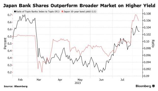 自从植田和男调整收益率以来,投资者也一直在推高商业银行的股价,因为他们预期贷款利润率将随着利率上升而扩大。该行业的一项股指自调整前一天以来上涨了约4%,相比之下,东证指数则小幅下跌。