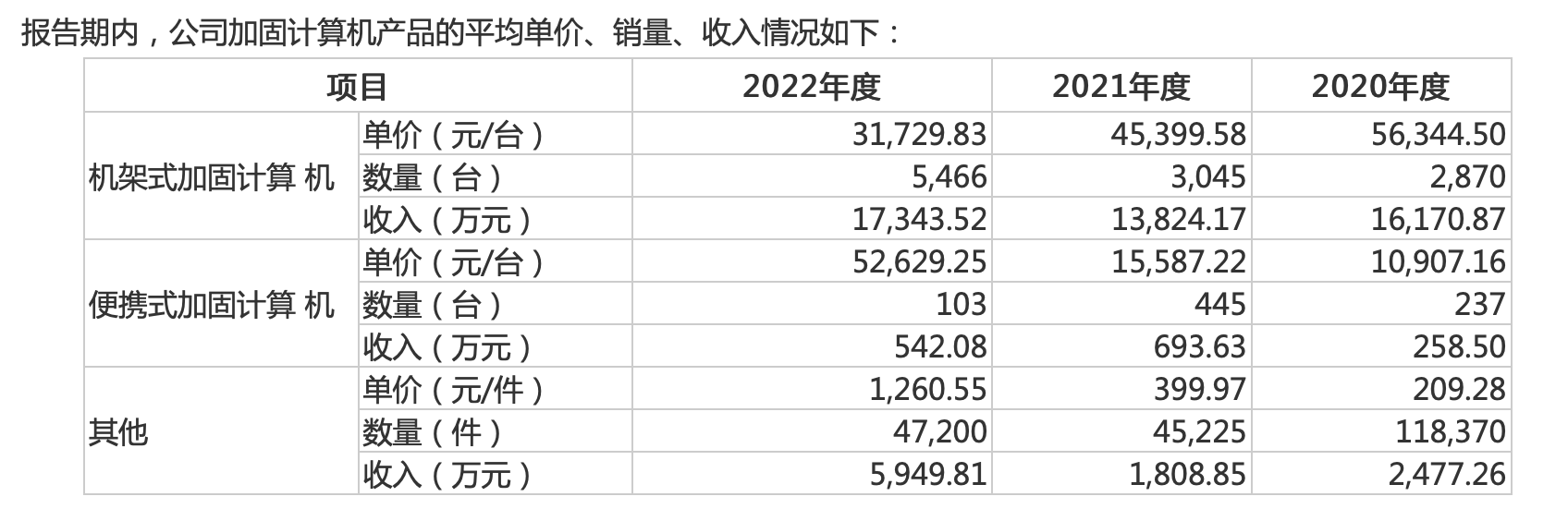 中航科电表示,机架式加固计算机平均单价下降、销售数量上升,主要是因销售了较多价格较低的低配置产品,拉低了均价。不过反观便携式加固计算机,虽然2022年单价暴涨237.18%,销量却从上年的445台降至103台。
