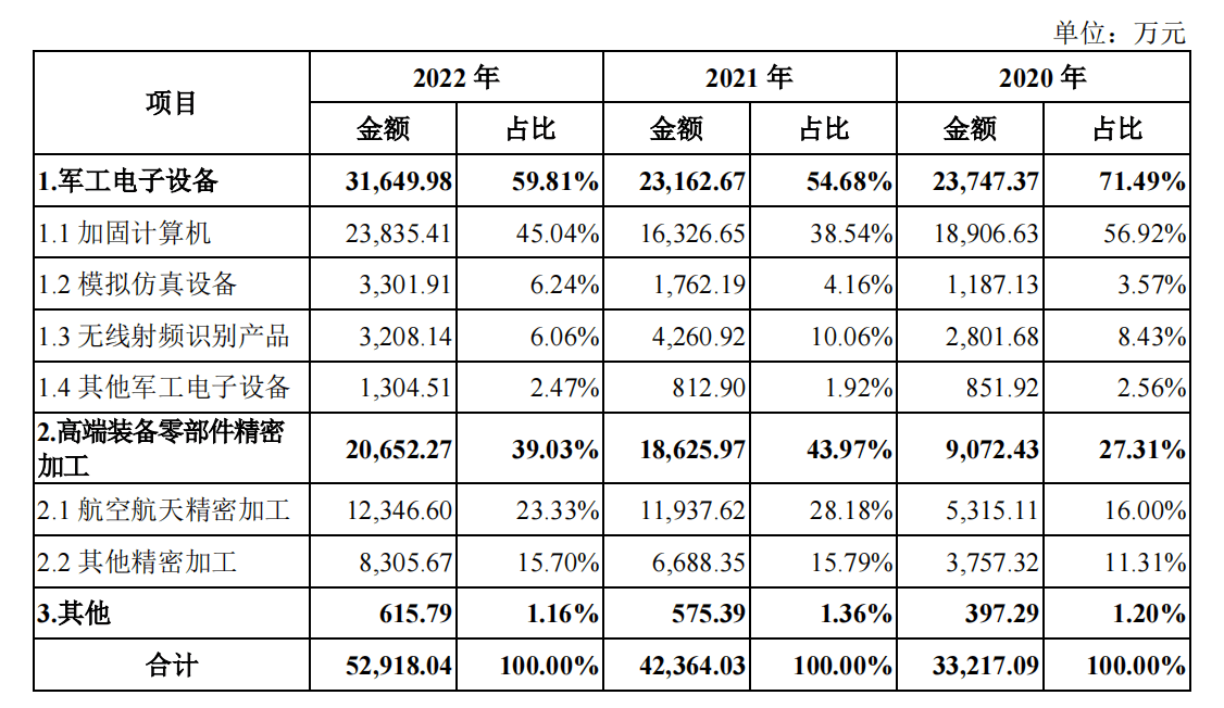 公司主营业务分为军工电子设备、高端装备零部件精密加工两大板块,2022年收入占比分别为59.81%和39.03%。其中,加固计算机作为公司的主要收入来源,收入占比达45.04%,几乎占了半壁江山。