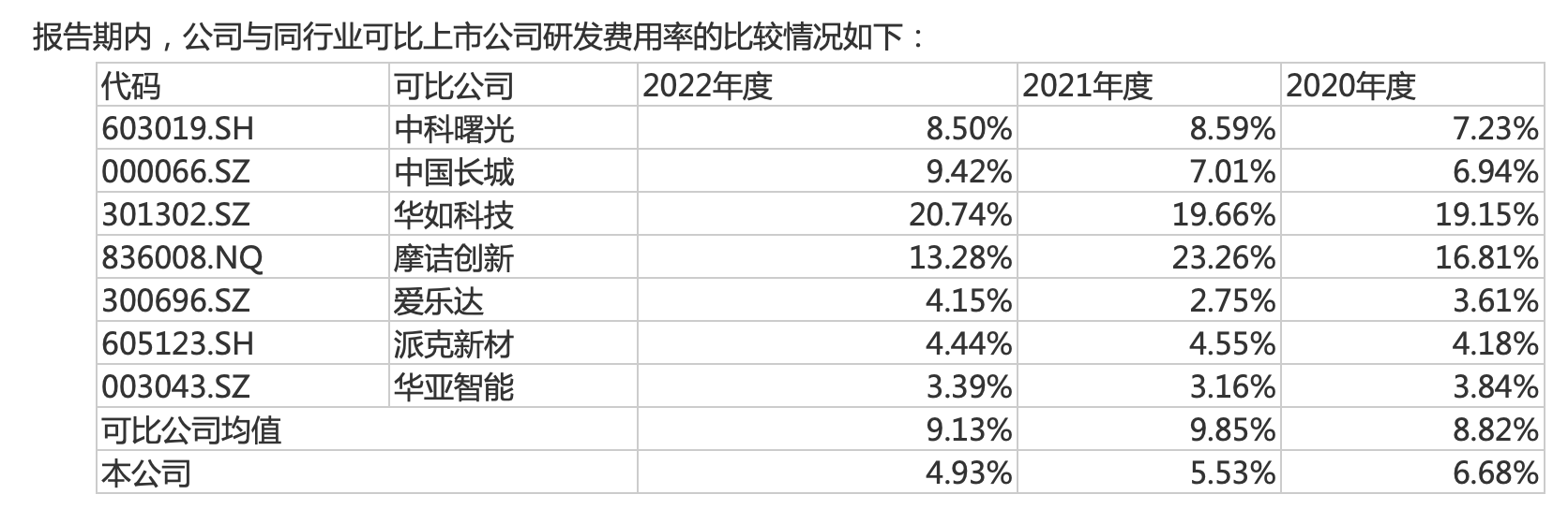 此外,公司生产的军工电子设备应用于各项尖端武器装备,对技术水平要求较高,但公司的规模和现金流使其研发投入较为受限。2020年至2022年,其研发费用分别为2221.81万元、2348.60万元和2614.52万元,占营业收入的比例分别为6.68%、5.53%和4.93%,始终低于可比公司均值8.82%、9.85%和9.13%。